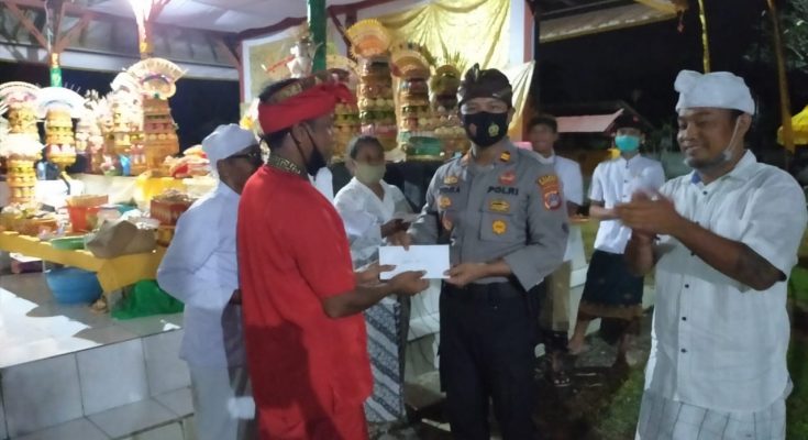 Diakhir kegiatan, Kapolsek Batui menyerahkan bantuan berupa Baju Adat Bali kepada Jero Mangku Eko Kayangan, Jero Mangku Prajapati dan Jero Mangku Istri, selanjutnya menyerahkan bantuan uang tunai kepada ketua PHDI Desa Sukamaju. (Hae/Mad)