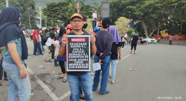Utustoria.com, Banggai – Ratusan massa yang tergabung dalam Gerakan Rakyat Peduli Demokrasi (Garda) Banggai melakukan aksi unjuk rasa di Tugu Adipura Luwuk, Kamis sore 19 Desember 2024.