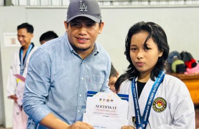Photo: Istimewa Utustoria.com, Banggai – Ketua Banggai Tarkwondo Club (BTC) Suwardi menyerahkan bonus kepada 13 Atlet peraih medali di ajang Open Turnamen...